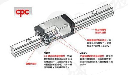 滑動導(dǎo)引若潤滑不足,將會造成接觸面金屬直接摩擦損耗床臺,而滑動導(dǎo)引要潤滑充足并不容易,需要在床臺適當(dāng)?shù)奈恢勉@孔供油。CPC直線導(dǎo)軌則已在滑塊上裝置油嘴,可直接以注油槍打入油脂,亦可換上專用油管接頭連接供油油管,以自動供油機(jī)潤滑。