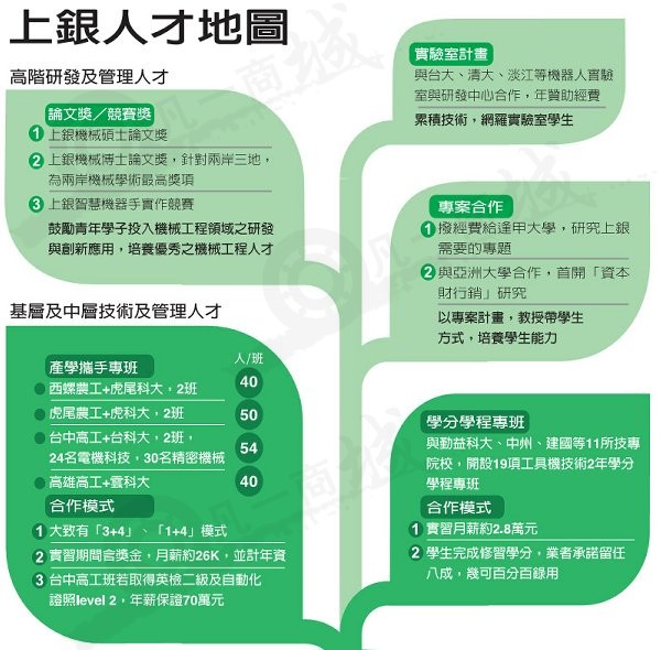 而今站在技職復興浪頭上,上銀導軌推出產學攜手專班,繼西螺農工后,現與虎尾高工、臺中高工、高雄高工合作,搭配不同的科大,在高工階段網羅人才。去年起更與工具機公會、勤益科大等十一所技專合作推出十九個兩年“學分學程專班”,學生只要完成規定修習學分,幾可百分之百錄用。