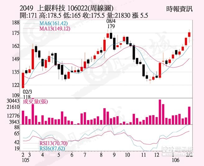 上銀(2049)因景氣好轉(zhuǎn)、大陸對智慧自動化及機器人需求持續(xù)升溫,滾珠螺桿、直線導(dǎo)軌及機器人等三大主力產(chǎn)品首季訂單滿載,訂單能見度看到4、5月,元月營收創(chuàng)同期次高,上周五吸引外資及自營商合計買超1,971張,推升股價上漲3.5元、收175.5元,單周漲幅3.24%。