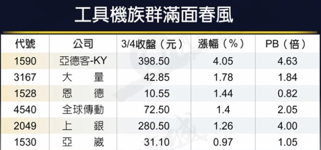 中美貿(mào)易談判樂(lè)觀,可望在3月底習(xí)川會(huì)簽成協(xié)議,為周一(4日)登場(chǎng)的「2019年臺(tái)北國(guó)際工具機(jī)展」增添大利多,亞德客、上銀等相關(guān)概念股滿面春風(fēng),搭配工具機(jī)搶攻自動(dòng)化概念商機(jī)發(fā)酵,買氣逐步歸隊(duì),全年?duì)I運(yùn)有望先蹲后跳。