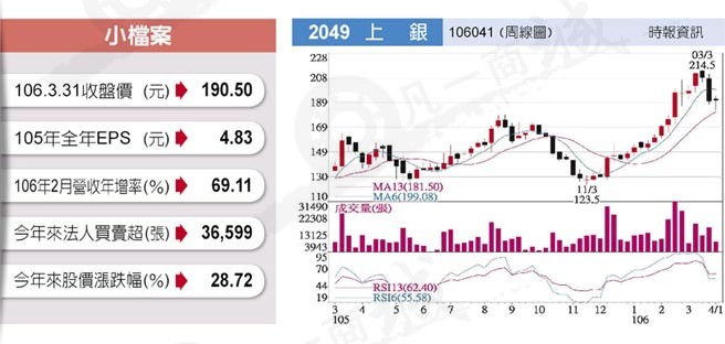 上銀大廠(2049)滾珠絲桿、直線導軌及機器人三大主力產品需求增溫,從去年第1季末到第2季初旺到現在,上半年訂單滿爆,生產線加班趕工,1至2月合并營收26.98億元,年增45.95%,擔心工具機廠重復下單,下半年轉趨謹慎,務實接單,全年合并營收有機會續創新高。