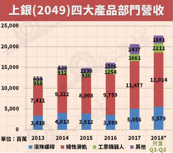 直線導(dǎo)軌和滾珠絲桿貢獻(xiàn)八成營收,2018年的第一季到第三季工業(yè)機(jī)器人部門年增率102%!