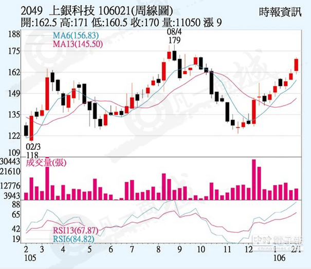 上銀大廠(2049)因滾珠螺桿、直線導軌及機器人三大主力產品,17年首季訂單因大陸對智慧自動化設備及機器人需求增溫而滿載,開始接第2季訂單,今年合并營收要挑戰200億元目標,上周五三大法人聯手買超1,599張,股價上漲7.5元、收170元,周漲幅5.59%。