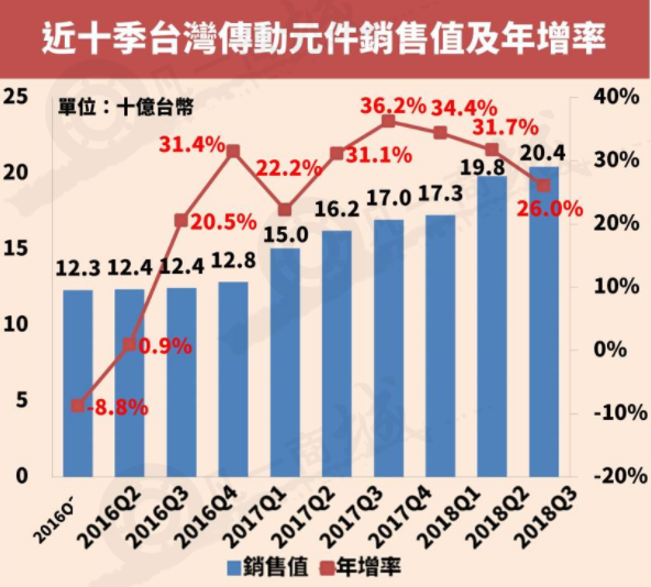 臺(tái)灣 2017 年生產(chǎn)傳動(dòng)組件的年產(chǎn)值已經(jīng)突破 600 億臺(tái)幣!其中超過(guò)七成的產(chǎn)值來(lái)自外銷!且滾珠絲桿之產(chǎn)值已列為全球第四。直線導(dǎo)軌與滾珠絲桿主要外銷區(qū)域?yàn)橹袊?guó)、南韓、德國(guó)、日本,所以傳動(dòng)組件產(chǎn)業(yè)是一個(gè)很典型的出口導(dǎo)向行業(yè)。另外,我們也注意到每一季的年增率相當(dāng)驚人,已經(jīng)連續(xù) 8 季有超過(guò) 20% 的成長(zhǎng)率!