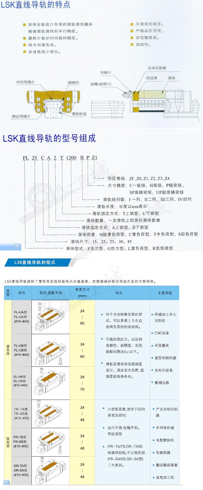 LSK直線導軌是一種滾動導引,它由鋼珠在滑塊與滑軌之間作無限滾動循環,使得負載平臺能沿著滑軌輕易的以高精度作線性運動,其摩擦系數可降至傳統滑動導引的1/50,使之能輕易地達到μm級的定位精度。滑塊與滑軌間的末制單元設計,使得線形滑軌可同時承受上下左右等各方向的負荷,專利的回流系統及精簡化的結構設計讓LSK的線性滑軌有更平順且低噪音的運動。