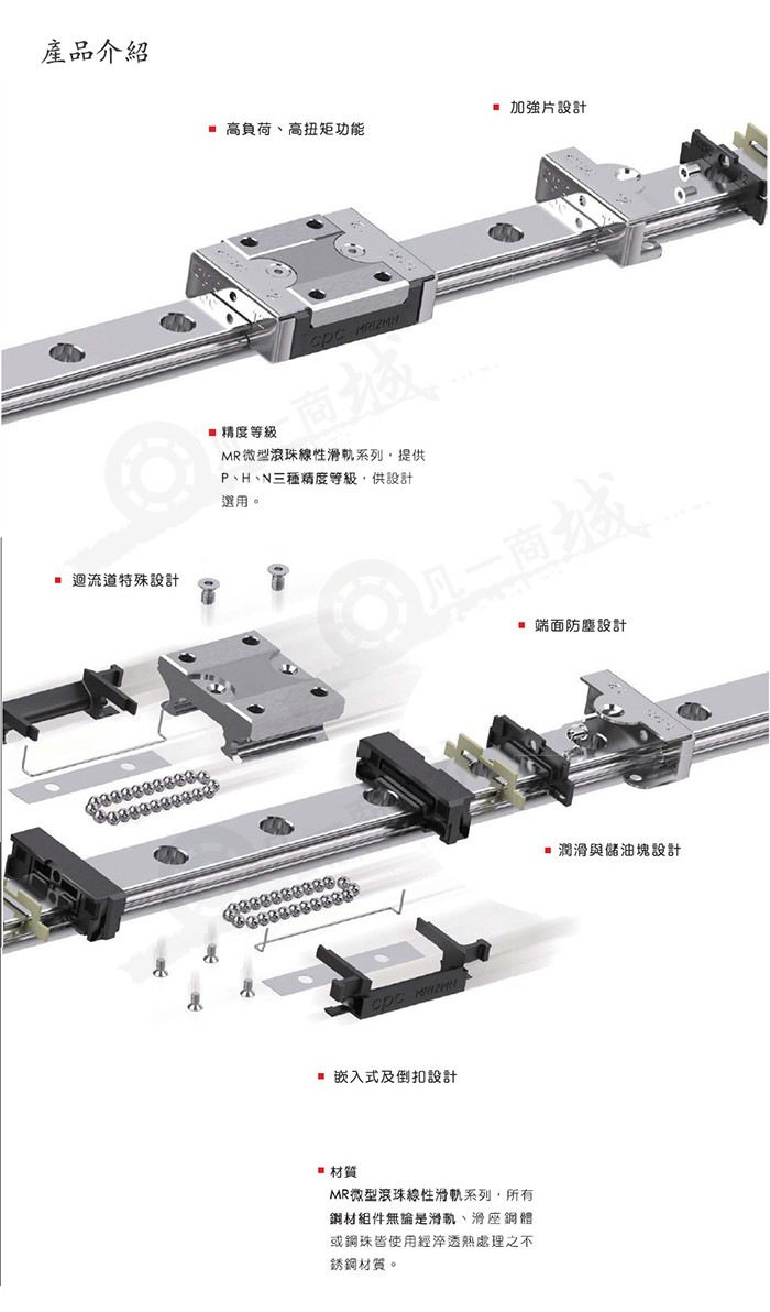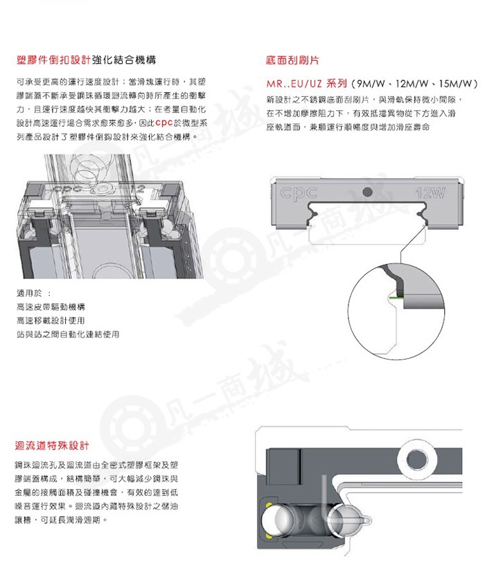 CPC直線導軌為一種滾動導引,借由鋼珠在滑塊與滑軌之間作無限滾動循環,負載平臺能沿著滑軌輕易地以高精度作線性運動。再加上滑塊與滑軌間的束制單元設計,使得CPC直線導軌可同時承受上下左右等各方向的負荷,上述陳列特點并非傳統滑動導引所能比擬,因此機臺若能配合滾珠螺桿,使用CPC直線導軌作導引,必能大幅提高設備精度與機械效能。與傳統的滑動導引相較,滾動導引的摩擦系數可降低至原來的1/50,由于起動的摩擦力大大減少,相對的較少無效運動發生,故能輕易達到μm級進給及定位。
