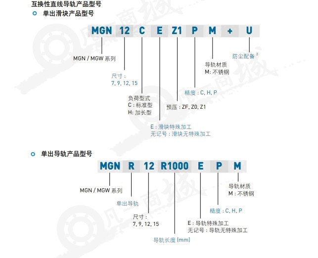 上銀直線導軌MGN系列具備非互換性型及互換性型兩種直線導軌,兩者規(guī)格尺寸相同,主要差異點在于互換性型上銀直線導軌之滑塊、導軌可單出互換使用,較便利,但其組合精度無法達到非互換性型之超高精度,不過由于HIWIN在制造上有良好的尺寸控制及嚴格的質(zhì)量要求,互換性型之組合精度目前已達到一定的水平,對不需配對安裝上銀直線導軌的客戶而言,是一項很好的選擇。上銀直線導軌MGN系列產(chǎn)品型號主要標明系列、尺寸、型式、精度等級、預壓等規(guī)格要求,以利訂貨時雙方對產(chǎn)品的確認。
